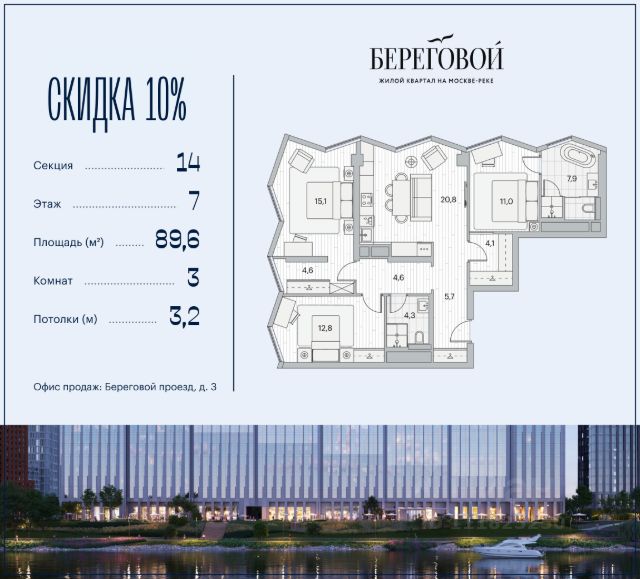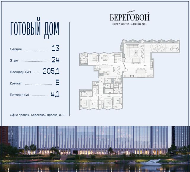 Река. Парк. Сити. Готовый дом в идеальном месте. Продается 2-комнатная квартира на 12 этаже с панорамным остеклением и видом на Береговой пр-д. Береговой — квартал-курорт в центре столицы. Готовый дом на первой линии Москвы-реки. Пешеходная набережная начинается прямо от дома — никаких дорог между вами и рекой. Уникальное сочетание природы парка Фили и ритма Сити. Ключи от нового образа жизни в Береговом: • 12 террас на крышах — ваши виды на Москву с высоты птичьего полета • Пешеходная набережная прямо у дома — ни одной машины между вами и рекой • Лобби с камином, переговорной и консьерж-сервисом • Флагманский Encore Fitness — самый большой в сети (4700 м²) с бассейном, термами и спа-комплексом • Детство на берегу Москвы-реки — в рамках проекта будут построены две школы и детский сад рядом с домом • Гастрономическая набережная: рестораны и премиум-сервисы откроются на первых этажах • Причал "Береговой" рядом с домом — путешествуйте по городу, пока другие стоят в пробках • Безопасность и уединение: контроль доступа на территорию, видеонаблюдение и круглосуточная диспетчерская • Двухуровневый подземный паркинг и кладовые Безупречная квартира для жизни: • Пространство света и воздуха: панорамные окна и высокие потолки 3.2 м • Технологии: центральное кондиционирование и роботизированная система очистки фасадов — вид из окна всегда будет идеальным • Совершенство планировки: просторная кухня-гостиная, минимум коридоров, максимум полезной площади • Квартира без отделки — возможность раскрыть преимущества планировки в вашем уникальном интерьере. Или выбирайте свою версию идеального дома в коллекции планировок: • С изолированными спальнями • Мастер-спальнями с гардеробными и ванными • Видовые ванные комнаты • Функциональные постирочные Эксклюзивные лоты: • Пентахусы с приватными террасами • Двухуровневые пентхаусы Локация, о которой мечтают 15 минут до Сити на машине — и вы в эпицентре деловой жизни. Две станции метро в пешей доступности — когда каждая минута на счету. Утром — пробежка по парку Фили, вечером — прогулка на велосипеде вдоль реки, выходные — водный спорт в Крылатском. Речные трамвайчики вместо такси, зеленые парки и благоприятная экология — привилегии престижного ЗАО Москвы. Условия покупки: выгодные программы покупки от застройщика, специальные условия при полной оплате. Оставляйте заявку на персональную презентацию в шоу-руме.