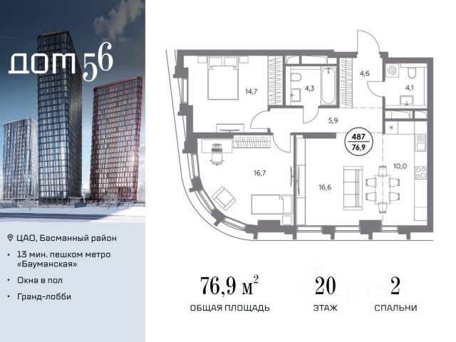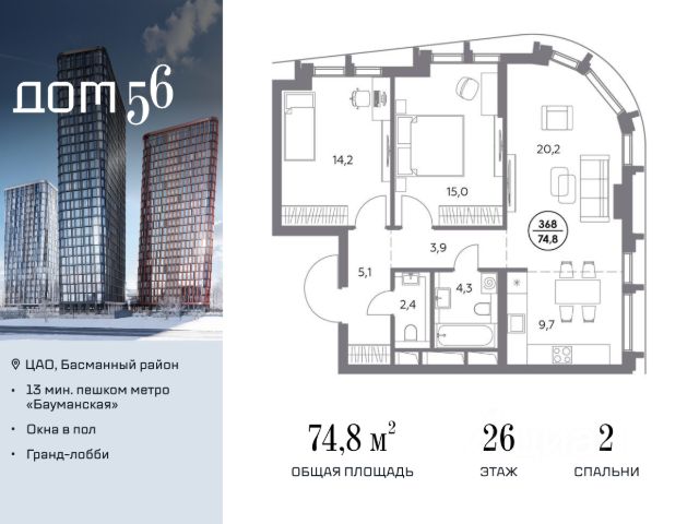В премиум-квартале "Дом 56" на Бауманской напрямую от девелопера ГК "Галс-Девелопмент" представлена 2-комнатная квартира на 18 этаже общей площадью 72.50 м². Квартира предлагается без отделки, со свободной планировкой. Пространство позволяет воплотить дизайн - проект в соответствии с Вашими предпочтениями. "Дом 56" - расположен в Басманном районе на ул. Фридриха Энгельса, всего в 12-15 минутах пешком от станций метро "Бауманская" и "Электрозаводская". Рядом с премиум-кварталом находятся важные городские магистрали - ТТК, набережная реки Яузы и Бакунинская улица, переходящая в Спартаковскую и Маросейку. Архитектурный стиль "Дома 56" - параметрический минимализм. Футуристические фасады квартала с "эффектом закручивания" словно вращаются вокруг своей оси. Динамичный образ башен дополняет эффектное остекление - окна в пол будут в каждой квартире. "Дом 56" станет органичным продолжением современной научно-креативной среды Басманного района: - Развитое окружение - десятки различных точек притяжения; - Близость престижных вузов: МГТУ, МЭИ и Британская высшая школа дизайна; - Соседство с Технологической долиной и всем необходимым для запуска стартапа; - Набережные и парки для спорта и отдыха. "Дом 56" оснащён первоклассными инженерными системами. Входы на территорию, в здание и паркинг оборудованы системой контроля и управления доступом. С любого этажа в лобби и паркинг спускаются быстрые и бесшумные лифты премиального бренда. Во внутреннем приватном дворе будет создано пространство в бионическом стиле с лаунж-зонами, подвесными качелями, детскими плейхабами для разных возрастов, площадками для спорта и отдыха в окружении зелени. На двух подземных уровнях предусмотрен подземный паркинг и кладовые помещения.