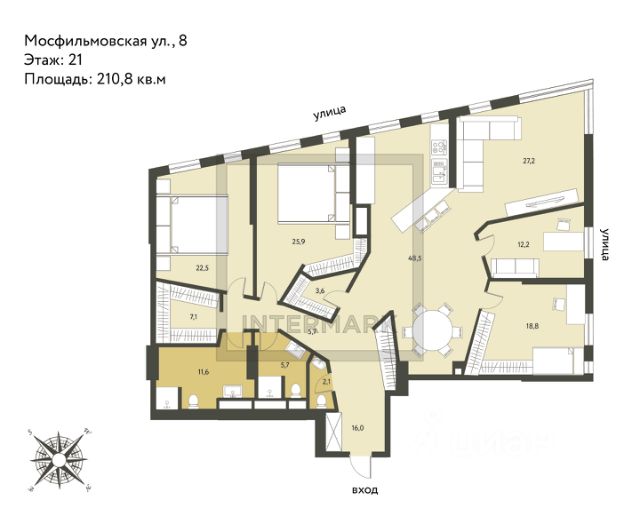 Квартира с 3-мя спальнями площадью 210 м² в комплексе бизнес-класса "Дом на Мосфильмовской" на 21-м этаже. Выполнена современная отделка с использованием натуральных материалов. Установлена система индивидуального кондиционирования. Квартира полностью меблирована и оснащена качественной бытовой техникой. Высота потолков 3,2 метра. Функциональная планировка включает просторную гостиную, мастер-спальню со своей гардеробной, вторую спальню, кабинет, который можно оборудовать как спальню, кухню, ванную комнату, 2 санузла, гардеробную и холл. Благодаря панорамному остеклению пространство наполнено естественным светом и теплом, открываются виды на Лужники и главное здание МГУ. Главное о доме. "Дом на Мосфильмовской" — две башни высотой 33 и 53 этажа, созданные по проекту Сергея Скуратова. Контраст светлых и тёмных фасадов подчёркивает динамику силуэта, а башни соединены семиэтажной галереей. Входные группы с потолками 7 метров отделаны мрамором и тропическими растениями, лобби работают как просторные гостиные с консьерж-сервисом. Во дворе высажены липы, разбиты цветники и спортивные площадки, проложены дорожки из гранита. Для жителей предусмотрены детские зоны, кафе и трёхуровневый подземный паркинг с автомойкой. Главное о локации. Комплекс стоит в Раменках, между заказником "Воробьёвы горы" и долиной реки Сетунь. В пяти минутах — Московский гольф-клуб и музей "Мосфильм", где проходят показы и выставки. Рядом Мосфильмовский пруд с аллеями для прогулок, а до Большого газона МГУ можно дойти за двадцать минут. Для семей рядом школа 74 и детский сад "Смайлик". От метро "Минская" всего 7 минут, а на машине легко выехать на ТТК: дорога до Садового кольца занимает около 12 минут. Комментарий эксперта. Меня зовут Сергей Герасимов — брокер компании Whitewill. Я отвечаю за продажу этого лота. Свяжитесь со мной, чтобы получить расширенную презентацию, больше фотографий или договориться о просмотре. Могу провести экскурсию по локации и познакомить вас с этим домом. ID 291 979. Продается квартира в ЖК Дом на Мосфильмовской в Москве.