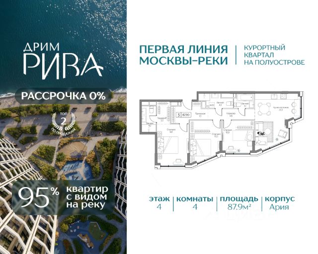 СТАРТ ПРОДАЖ ВИДОВЫХ КВАРТИР Квартира со 100% видом на Москву-реку в премиальном квартале Дрим Рива — первая линия Москвы-реки. На территории курортной локации "Остров мечты". 79.7 кв.м, 3 комнаты, 3 этаж. Высота потолков 3,1 м. • 95% квартир смотрят на воду • Мастер-спальня с гардеробной • Естественный свет в гостиной с двух сторон ЛОКАЦИЯ И ТРАНСПОРТ • 15 минут на авто до Садового кольца, • 30 минут до Москва-Сити и Кремля. • 10 минут до метро "Технопарк" в пешей доступности. В перспективе — станция "Остров мечты" (2028г.). ИНФРАСТРУКТУРА КВАРТАЛА • 3 Га приватного двор-парка с зонами для спорта, йоги и отдыха; • Благоустроенная набережная с гастропроменадом; • Клубные лобби с инфраструктурой; • Премиум SPA-центр с бассейном и фитнес-клуб; • Государственный детский сад под окном и школа в 10 минутах от квартала; • Подземный и гостевой паркинг. ИНФРАСТРУКТУРА ДЛЯ СЕМЕЙ — государственные детский сад и школа на территории. 44 гектара парков вокруг создают условия для прогулок, спорта и детск ого досуга. ПРИВИЛЕГИИ РЕЗИДЕНТОВ • Пляжный клуб Dream Beach Club; • Яхт-клуб Dream Yacht Club; • Вейк-клуб; • Парк развлечений "Остров мечты"; • 44 Га парков для прогулок и спорта в окружении квартала. БЕЗОПАСНОСТЬ И КОМФОРТ • Приватная территория; • Охрана; • Видеонаблюдение; • Консьерж-сервис 24/7; • Современные инженерные системы и технологии умного дома. НАДЕЖНЫЙ ЗАСТРОЙЩИК Regions Development — успешная девелоперская компания. За 20 лет работы реализовали уже более 30 проектов в сегментах коммерческой и многофункциональной недвижимости. Скидки действуют только при 100% оплате и ипотеке Скидки действуют только при 100% оплате, ипотеке и рассрочке. Скидки и акции не суммируются. Звоните, чтобы договориться о просмотре!