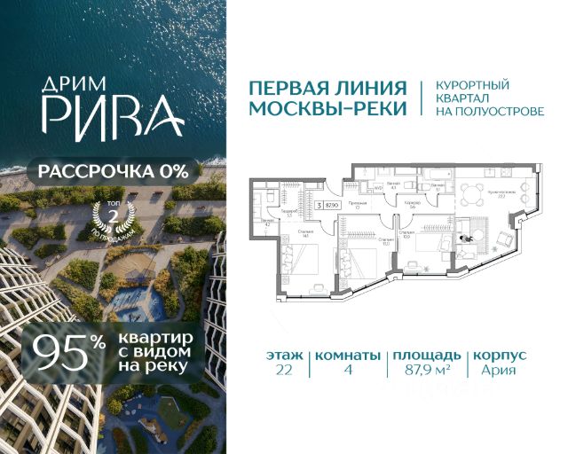 СТАРТ ПРОДАЖ ВИДОВЫХ КВАРТИР Квартира со 100% видом на Москву-реку в премиальном квартале Дрим Рива — первая линия Москвы-реки. На территории курортной локации "Остров мечты". 79.7 кв.м, 3 комнаты, 23 этаж. Высота потолков 3,1 м. • 95% квартир смотрят на воду • Мастер-спальня с гардеробной • Естественный свет в гостиной с двух сторон ЛОКАЦИЯ И ТРАНСПОРТ • 15 минут на авто до Садового кольца, • 30 минут до Москва-Сити и Кремля. • 10 минут до метро "Технопарк" в пешей доступности. В перспективе — станция "Остров мечты" (2028г.). ИНФРАСТРУКТУРА КВАРТАЛА • 3 Га приватного двор-парка с зонами для спорта, йоги и отдыха; • Благоустроенная набережная с гастропроменадом; • Клубные лобби с инфраструктурой; • Премиум SPA-центр с бассейном и фитнес-клуб; • Государственный детский сад под окном и школа в 10 минутах от квартала; • Подземный и гостевой паркинг. ИНФРАСТРУКТУРА ДЛЯ СЕМЕЙ — государственные детский сад и школа на территории. 44 гектара парков вокруг создают условия для прогулок, спорта и детск ого досуга. ПРИВИЛЕГИИ РЕЗИДЕНТОВ • Пляжный клуб Dream Beach Club; • Яхт-клуб Dream Yacht Club; • Вейк-клуб; • Парк развлечений "Остров мечты"; • 44 Га парков для прогулок и спорта в окружении квартала. БЕЗОПАСНОСТЬ И КОМФОРТ • Приватная территория; • Охрана; • Видеонаблюдение; • Консьерж-сервис 24/7; • Современные инженерные системы и технологии умного дома. НАДЕЖНЫЙ ЗАСТРОЙЩИК Regions Development — успешная девелоперская компания. За 20 лет работы реализовали уже более 30 проектов в сегментах коммерческой и многофункциональной недвижимости. Скидки действуют только при 100% оплате и ипотеке Скидки действуют только при 100% оплате, ипотеке и рассрочке. Скидки и акции не суммируются. Звоните, чтобы договориться о просмотре!