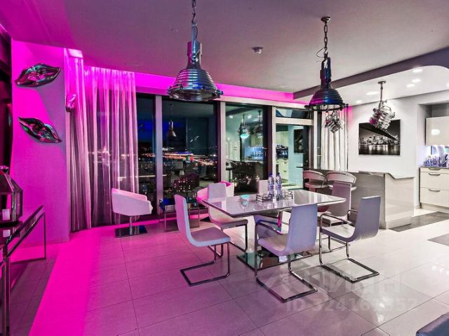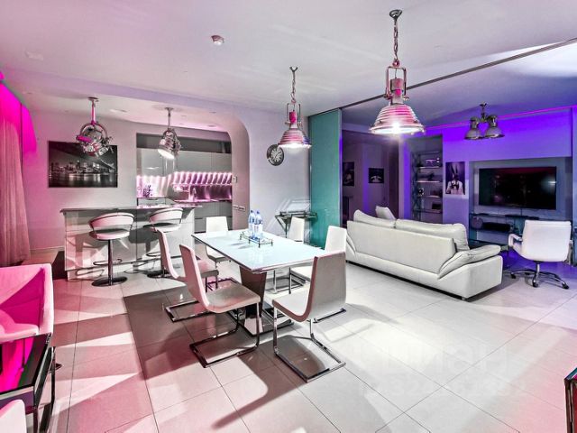 Помещение с панорамным остеклением разделено на два обособленных апартамента площадью 66 м² и 38 м². Апартаменты расположены на сорок восьмом этаже в башне "Санкт-Петербург".