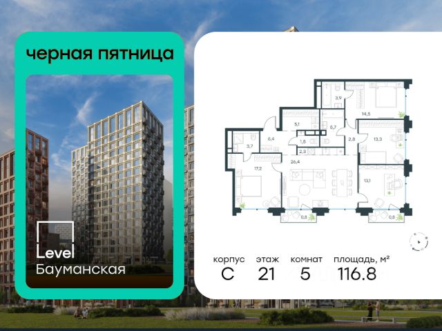 Цена указана с учётом скидки Цена указана с учётом скидки при 100%-й оплате, несубсидированной ипотеке, рассрочке (кроме программы "Рассрочка 0%"). В Басманном районе (ЦАО) продается 3-комнатная квартира площадью 70.40 кв.м без отделки. Квартира расположена на 2 этаже 13-этажного корпуса " A" в жилом комплексе бизнес-класса Level Бауманская (компания Level Group). Отличная транспортная доступность: - 15 мин. пешком до метро "Бауманская" и "Электрозаводская"; - 4 мин. на авто до ТТК; - 8 мин. на авто до Садового кольца; - 15 мин. на авто до Кремля. Продуманный архитектурный проект: - Архитектура от бюро ARCH(E)TYPE, вдохновленная историей района; - 95% квартир с панорамными видами на набережные, парки и сталинские высотки; - Высокие потолки от 3,02 м до 6,3 м; - Лобби с комфортными лаунж-зонами; - Благоустроенный закрытый двор без машин. Расположение и инфраструктура: Level Бауманская расположен в престижном Басманном районе (ЦАО). В пешей доступности находится легендарный МГТУ им. Баумана, Британский и Ломоносовский лицеи, а за 10 минут на автомобиле можно доехать до НИУ ВШЭ и других престижных вузов. На территории проекта предусмотрена развитая внутренняя инфраструктура: собственный детский сад и 10 коммерческих помещений на первых этажах домов. Благоустройство: Концепция благоустройства создана в соавторстве с именитым бюро GAFA. На площади 0,35 га расположатся зоны для отдыха, занятий спортом и прогулок. Во дворе для жителей жилого комплекса будет создан коворкинг прямо на свежем воздухе - открытые беседки и Wi-Fi на территории. Атмосферу приватности подчеркнёт обилие растительности - деревья и кустарники займут 50% двора. За счёт большого количества хвойных насаждений территория жилого комплекса будет зелёной круглый год. Инженерия и комфорт: Жители Level Бауманская не зависят от сезонного отключения горячей воды. Для этого в проекте предусмотрены центральные водонагреватели, обеспечивающие комфорт круглый год. Для безопасности созданы следующие системы контроля доступа: круглосуточное видеонаблюдение всех общественных зон (лобби, двор, лифты, паркинг), вызывные панели у входов на закрытую территорию, видеодомофоны с возможностью управления через мобильное приложение, распознавание автомобильных номеров при въезде/выезде в/из паркинга. По заявке собственнику предоставляется возможность просмотра изображения отдельных видеокамер. Лифты: В жилом комплексе устанавливается лифтовое оборудование Sicher Elevator - одного из ведущих производителей с 20-летним опытом и 40 представительствами по всему миру. Кабины от Sicher Elevator отличаются тихим и плавным ходом, особой износостойкостью и современными технологическими и дизайнерскими решениями. Все лифты имеют прямой доступ в паркинг с жилых этажей. В домах также предусмотрен сервисный лифт. Грузоподъёмность лифтов от 450 до 1000 кг, скорость 1,6 м/с.