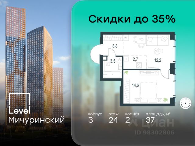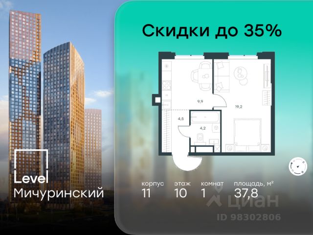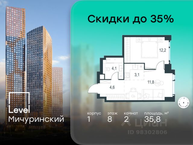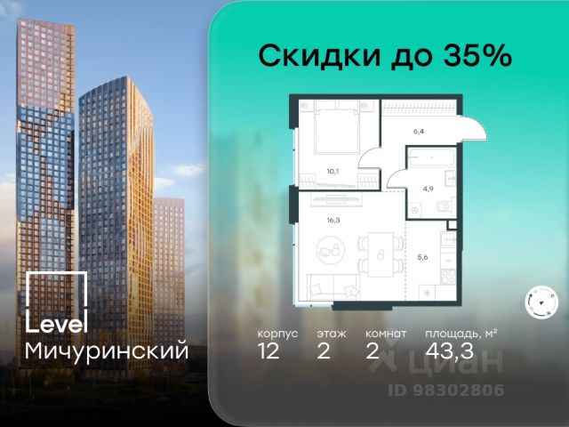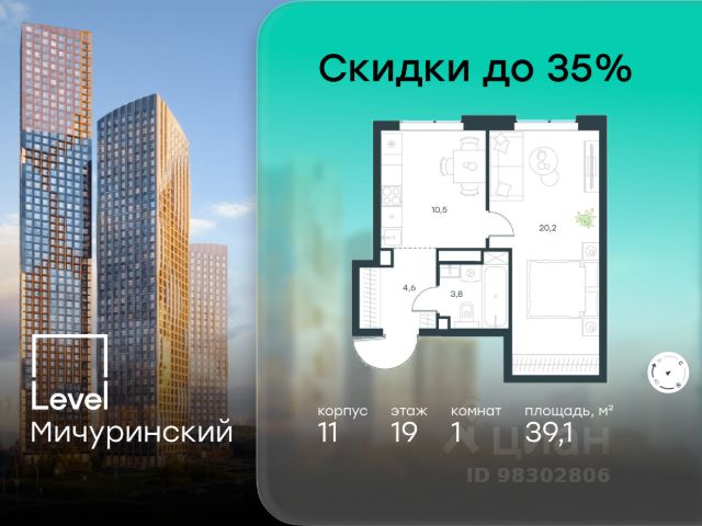 Цена указана с учётом скидки при 100%-й оплате, несубсидированной ипотеке, рассрочке (кроме программы "Рассрочка 0%"). В жилом квартале, расположенном на границе с природным заказником "Долина реки Очаковки", продаётся 2-комнатная квартира площадью 41.90 кв.м без отделки. Квартира расположена на 4 этаже 24-этажного корпуса 7 в жилом комплексе бизнес-класса Level Мичуринский (компания Level Group/Левел групп). Отличная транспортная доступность - 10 мин. пешком до станции метро "Мичуринский проспект" - 15 мин. пешком до станции метро "Аминьевская" - 7 мин. на авто до МКАД - 10 мин. на авто до ТТК - 15 мин. на авто до Москва-Сити Продуманный архитектурный проект - Выразительная архитектура от известных бюро: корпуса 1-6 - СПИЧ, корпуса 7-13 - Borisov Architects; - Из окон открываются живописные виды на парки, Москва-Сити и МГУ; - Высокие потолки до 6,35 м; - Стильные лобби с окнами в пол и высокими потолками до 4,7 м; - С каждого этажа дома на лифте можно спуститься в подземный отапливаемый паркинг. Расположение Level Мичуринский строится в одном из самых зеленых районов Москвы - Очаково-Матвеевское. Этот уголок столицы идеален для поддержания здорового образа жизни. В шаговой доступности от проекта находятся заказник "Долина реки Очаковки" - 1 мин. пешком и Очаковский парк - 7 мин. пешком. На велосипеде можно добраться до таких парков, как "Событие", парк Олимпийской деревни, парк 50-летия Октября и парк Школьников. В 15-минутной доступности на авто расположено более 30 детских садов (из них 14 в пешей доступности), 32 школы (из них 13 в пешей доступности) и 14 вузов. В ближайшем окружении работает более 25 медицинских учреждений, 11 спортивных клубов и 22 продуктовых супермаркета. Внутренняя инфраструктура На территории жилого комплекса строится три детских сада и школа. На первых этажах домов откроется супермаркет, фитнес-центр, ресторан, кафе и другие сервисы. Подземные этажи займут паркинги: трехуровневые в этапах 1 и 2, одноуровневый в этапах 3 и 4. Преимущества проекта - 4,5 га благоустроенной территории с видовым мостом, уличным кинотеатром, зонами для тихого отдыха, работы, воркаута, площадки для петанка, футбола, настольного тенниса и пляжного волейбола; - Дизайнерские лобби с панорамным видом на двор, мойками для лап животных и комфортными зонами ожидания. - Безопасность жителей: круглосуточное видеонаблюдение всех зон общего пользования (лобби, лифты, паркинги, детские площадки), система контроля доступа, управление видеодомофоном через мобильное приложение, единый ключ доступа на территорию жилого комплекса. - Технологии и комфорт: высокоскоростной Wi-Fi в лобби и на придомовой территории, автоматическая система контроля и учета ресурсов, абонентская связь с консьержем, распознавание номеров автомобилей при въезде/выезде в/из паркинга.