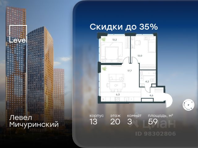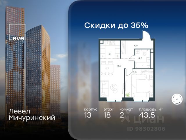 Скидка 35% на все квартиры в жилом комплексе Левел Мичуринский, этапы 3 и 4 (корпуса 7-13). Цена указана с учётом скидки при 100%-й оплате, несубсидированной ипотеке, рассрочке (кроме программы "Рассрочка 0%"). В жилом квартале, расположенном на границе с природным заказником "Долина реки Очаковки", продаётся 2-комнатная квартира площадью 43.50 кв.м без отделки. Квартира расположена на 18 этаже 31-этажного корпуса 13 в жилом комплексе бизнес-класса Левел Мичуринский (компания Level Group/Левел групп). Отличная транспортная доступность: - от 10 мин. пешком до станции метро "Мичуринский проспект" - 15 мин. пешком до станции метро "Аминьевская" - 7 мин. на авто до МКАД - 10 мин. на авто до ТТК - 15 мин. на авто до Москва-Сити Продуманный архитектурный проект: - Выразительная архитектура от известных бюро: корпуса 1-6 - бюро СПИЧ, корпуса 7-13 - архитектурное бюро Анатолия Борисова; - Из окон открываются живописные виды на парки, Москва-Сити и МГУ; - Высокие потолки до 6,35 м; - Стильные лобби с окнами в пол и высокими потолками до 4,7 м; - С каждого этажа дома на лифте можно спуститься в подземный отапливаемый паркинг. Расположение: Жилой комплекс Левел Мичуринский строится в одном из самых зелёных районов Москвы - Очаково-Матвеевское. Этот уголок столицы идеален для поддержания здорового образа жизни. В шаговой доступности от проекта находятся заказник "Долина реки Очаковки" - 1 мин. пешком и Очаковский парк - 7 мин. пешком. На велосипеде можно добраться до таких парков, как "Событие", парк Олимпийской деревни, парк 50-летия Октября и парк Школьников. В 15 минутах езды на авто расположено более 30 детских садов (из них 14 в пешей доступности), 32 школы (из них 13 в пешей доступности) и 14 вузов. Также в ближайшем окружении - более 25 медицинских учреждений, 11 спортивных клубов и 22 продуктовых супермаркета. Внутренняя инфраструктура: На территории жилого комплекса строится три детских сада и школа. На первых этажах домов откроется супермаркет, фитнес-центр, ресторан, кафе и другие сервисы. Подземные этажи займут паркинги: трёхуровневые - в этапах 1 и 2, одноуровневый - в этапах 3 и 4. Преимущества проекта: - 4,5 га благоустроенной территории с видовым мостом, уличным кинотеатром, зонами для тихого отдыха, работы, уличных тренировок, площадки для петанка, футбола, настольного тенниса и пляжного волейбола. - Дизайнерские лобби с панорамным видом на двор, мойками для лап животных и комфортными зонами ожидания. - Безопасность жителей: круглосуточное видеонаблюдение всех зон общего пользования (лобби, лифты, паркинги, детские площадки), система контроля доступа, управление видеодомофоном через мобильное приложение, единый ключ доступа на территорию жилого комплекса. - Технологии и комфорт: высокоскоростной вайфай в лобби и на придомовой территории, автоматическая система контроля и учёта ресурсов, абонентская связь с консьержем, распознавание номеров автомобилей при въезде в паркинг и выезде из н