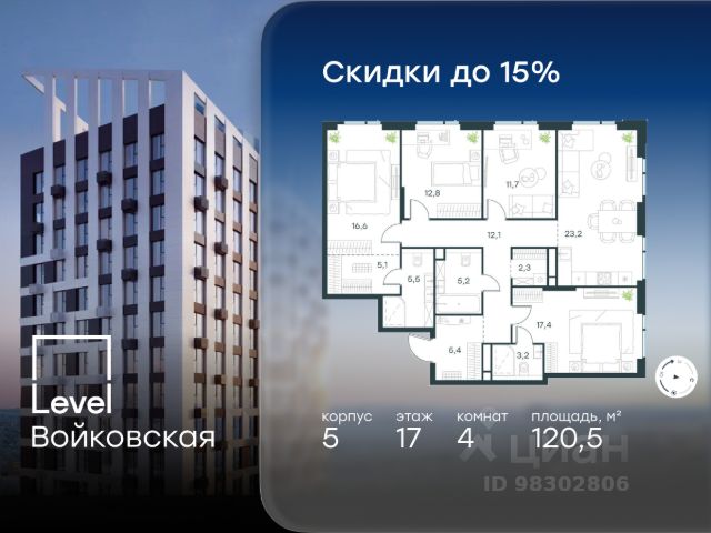 Цена указана с учётом скидки при 100%-й оплате, несубсидированной ипотеке, рассрочке (кроме программы "Рассрочка 0%"). Продается 1-комнатная квартира площадью 42.30 кв. м без отделки. Квартира находится на 3 этаже 20-этажного корпуса 3, в новом жилом комплексе бизнес-класса Level Войковская, расположенном рядом с живописным заповедником "Покровское-Стрешнево" (застройщик - компания Level Group/Левел групп). Прекрасная транспортная доступность - 7 мин. пешком до станции МЦК "Балтийская"; - 15 мин. пешком до станции метро "Войковская"; - 8 мин. на машине до ТТК; - 15 мин. на машине до центра Москвы; - 20 мин. на машине до Москва-Сити. Продуманный архитектурный проект - стильная архитектура от мастерской Фефелова В. В.; - панорамные виды на парки, Химкинское водохранилище и Останкинскую башню; - лобби с высотой потолков до 6,45 метров; - более 20 видов планировочных решений, включая редкие форматы квартир с террасой и увеличенной высотой потолков до 5,42 метров; - 2 варианта дизайнерской отделки в корпусе 4, предлагаются как дополнительная опция к отделке white box: стиль Modern в светлых холодных тонах и стиль Classic в нейтральной бежевой гамме. Квартиры в корпусах 3 и 5 сдаются без отделки. Расположение Level Войковская строится в престижном Северном округе Москвы. Развитая инфраструктура и живописная природа переплетаются в единый ансамбль, столь значимый для комфортной жизни. Войковский район окружают парки и набережные. В шаговой доступности - парк "Покровское-Стрешнево", не более 15-ти минут на велосипеде занимает путь до Тимирязевского парка и 9-ти минут до парка усадьбы Михалково. Рядом более 60 школ, 75 дошкольных учреждений, 17 государственных и 6 частных вузов, 25 супермаркетов, 4 торговых центра, среди которых ТЦ "Метрополис" и ТЦ "Авиапарк". Внутренняя инфраструктура На территории жилого комплекса предусмотрены коммерческие помещения: кафе, ресторан, пекарня и другие сервисы откроются на первых этажах корпусов. Для жителей будет доступен отапливаемый подземный паркинг на 244 машино-места с доступом с любого этажа на лифте. На территории паркинга будет расположено 125 кладовых помещений для хранения сезонного инвентаря. Лобби и благоустройство Дизайн лобби Level Войковская создан совместно с бюро BLANK. Это уютные гостиные, где хочется задержаться. Теплая цветовая гамма, ресепшен, зоны ожидания, лапомойки и гостевые санузлы - каждая деталь превращает лобби в комфортное продолжение вашего дома. 1,15 га площади в первых двух этапах строительства отведено под приватный внутренний двор, который спроектирован совместно с бюро "Правда". Детские площадки для всех возрастов, спортивные пространства для йоги, воркаута и петанка, уютные зоны для тихого отдыха или работы. Здесь утро начинается с вдохновения, а вечер наполнен приятными моментами. Лифты Комфортное перемещение внутри жилого комплекса будут обеспечивать надёжные лифты с доступом в паркинг с жилых этажей. В каждом корпусе предусмотрено по 3 грузопассажирских лифта.