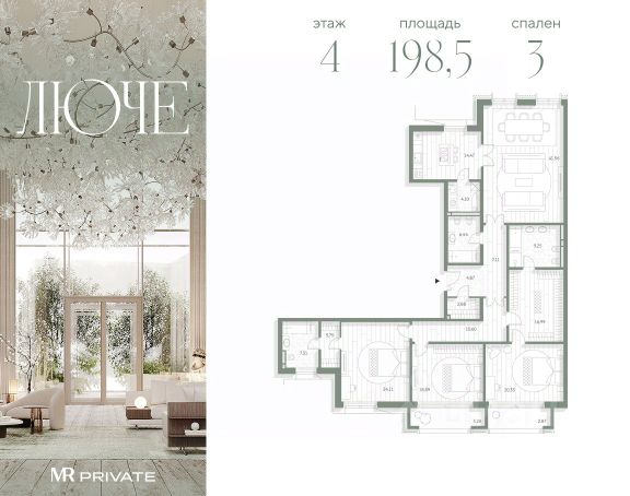 4-комнатная квартира общей площадью 268.23 м² в фамильном доме Люче, расположенная на 5 этаже 7-этажного дома. Люче — клубный дом в самом сердце исторической Москвы, в охранной зоне Кремля. Уникальный фамильный дом предлагает 43 квартиры, площадью от 79 до 384 м², спроектированные для тех, кто ценит приватность, пространство и изысканность. Дизайн и архитектура Архитектурная концепция клубного дома Люче была разработана в известном итальянском бюро Archea Associati, основанном Марко Казамонти во Флоренции в 1988 году. Каждая деталь в Люче продумана до мелочей, чтобы обеспечить резидентам максимальный комфорт и эстетическое удовольствие. Центральное гранд-лобби с потолками высотой 9 м — просторное помещение, объединяющее три входные группы, западное лобби с музыкальной гостиной и восточное с библиотекой. Благоустройство и инфраструктура Главное сокровище Люче — секретный сад. Тихие тропинки вьются между тенистыми пространствами, создавая множество уютных уголков для отдыха и размышлений. Прогулка по тенистым аллеям сада становится своего рода медитацией, которая помогает восстановить силы и зарядиться энергией на новый день. Не покидая территорию своего дома, резиденты Люче могут пользоваться эксклюзивными пространствами и сервисами: beauty-кабинет; зал для фитнеса и йоги,детская игровая комната, кабинет для индивидуальных занятий с репетитором, переговорная. Инженерные решения В каждой квартире предусмотрены: индивидуальные системы приточно-вытяжной вентиляции с очисткой воздуха и кондиционирования; система увлажнения воздуха; очистка и умягчение воды; система бесперебойного горячего водоснабжения; система "Умный дом": управление климатом, освещением, шторами, системой защиты от протечек, возможность установки дополнительных сервисов,а также, подогрев террас и балконов. Для всего дома предусмотрено усиление сигнала сотовой связи и wi-fi на территории всего дома, в том числе в саду и паркинге; бесшумные лифты с дизайнерской отделкой; подогрев покрытий входных групп; -вакуумное мусороудаление. Безопасность обеспечивают камеры круглосуточного видеонаблюдения, установленные по всему комплексу здания и на территории, а также автоматическая система распознавания госномера при въезде в паркинг. Паркинг Одноуровневый паркинг имеет увеличенные габариты машиномест. Здесь предусмотрены места для зарядных станций повышенной мощности, благодаря которым электрокар можно зарядить всего за 20 минут.