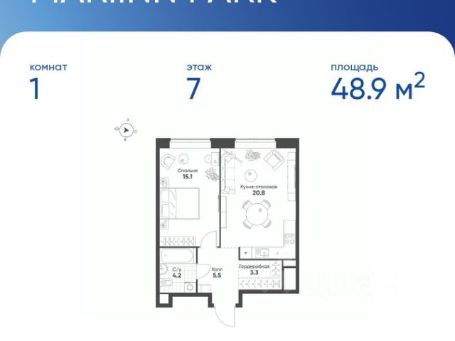 Продается квартира 48, по адресу г. Москва, ул. Октябрьская 103, корпус MariInn Park в Mariinn Park на 7 этаже, с площадью 48.9 м2.
