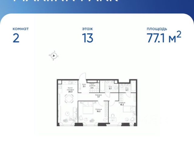 Продается квартира 89, по адресу г. Москва, ул. Октябрьская 103, корпус MariInn Park в Mariinn Park на 13 этаже, с площадью 77.1 м2.