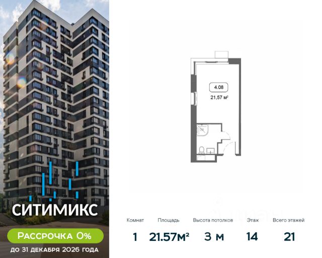 Продаётся студия в корпусе 5, общей площадью 21.97 м², на 18 этаже. Строительство корпуса завершено. Срок ввода — июль 2026 года. В 2026 году запланирован перевод корпуса в жилой фонд, что позволит собственникам оформить постоянную регистрацию в Москве. МФК "СИТИМИКС" — студии комфорт-класса, расположенные в районе Тропарёво-Никулино в Западном административном округе Москвы. Комплекс включает в себя пять 21-этажных корпусов и собственный парк между ними. Архитектурный облик комплекса, разработанный бюро "ADM", выполнен в современном стиле, а для наружной отделки, уникальной для каждого здания, использовались керамогранитные плиты разных оттенков, витражное остекление и натуральный камень. Все студии в новостройке оснащены современным оборудованием, включая счетчики с возможностью автоматического сбора данных. Во всех подъездах спроектированы уютные лобби-зоны и индивидуальные кладовые. Наличие обширного паркинга, где могут разместиться более 650 автомобилей, позволит закрыть зеленый дворик новостройки для проезда машин и обеспечить жителям уютное, комфортное пространство для семейного отдыха. Первые этажи займут коммерческие помещения, предназначенные для социально-бытовых объектов. В 10 минутах ходьбы расположен парк Школьников, на территории которого есть Очаковские пруды и протекает река Очаковка. В пешей доступности расположен еще один зеленый массив - Тропарёвский лесопарк, занимающий площадь в 218 га. Здесь проложены дорожки для велосипедистов, роллеров и бегунов, обустроены детские площадки и зоны отдыха. Рядом с комплексом находятся детские сады, школа, медклиника, центр развития ребенка, магазины, кафе и отделения банков. Идеальный вариант для студентов, т.к. City-комплекс расположен с такими университетами, как: РАНХиГС, РУДН, РТУ МИРЭА и РНИМУ им. Н.И. Пирогова. МФК "СИТИМИКС" находится в 1,5 км от станции метро "Озерная" и 2,4 км от станции метро "Юго-Западная. Автомобилистам будет удобно воспользоваться выездом на МКАД (3,2 км). Застройщиком квартала выступает компания APSIS GLOBE, основанная в 2008 году. В качестве девелопера компания успешно завершила ряд инфраструктурных, коммерческих объектов на территории Московской области, Москвы, Санкт-Петербурга.