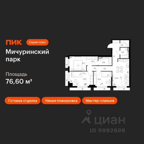 Продаётся 3-комн. квартира площадью 72,9 кв.м на 8 этаже 32 этажного дома (Корпус 4.1, Секция 1) проекта ПИК Мичуринский парк. Светлый просторный подъезд на уровне земли, функциональная планировка, большие окна, c отделкой. "Мичуринский парк" расположен на западе Москвы, в районе Очаково-Матвеевское, в 7 минутах пешком от метро "Озёрная". У подъездов будет два выхода: на улицу и во двор-парк. В наших дворах мы установим столы и лавочки со встроенными зарядными устройствами. Не нужно будет возвращаться домой, чтобы зарядить смартфон или ноутбук: можно весь день работать на свежем воздухе. В лобби "Мичуринского парка" будет удобная зона ожидания, где можно встретить друзей, курьера или дождаться такси, а также гостевая туалетная комната со столиком для пеленания. На территории проекта предусмотрен подземный паркинг и кладовые с надежной системой вентиляции, пожаротушения и системой круглосуточного видеонаблюдения. Собственная инфраструктура проекта включает два детских сада и две школы. Вдоль всего "Мичуринского парка" будут проходить несколько пешеходных бульваров с местами для отдыха. Рядом с проектом несколько зелёных зон, которые прекрасно подойдут для отдыха и спорта на свежем воздухе. Жители "Мичуринского парка" смогут выбирать, куда отправиться на прогулку: в пешей доступности Очаковский парк, парк Школьников и парк Олимпийской деревни, а на автомобиле можно быстро добраться до Тропарёвского лесопарка и Мещерского парка. Вблизи "Мичуринского парка" расположены ведущие вузы: МИРЭА, МГИМО, РАНХиГС, Институт радиотехники и телекоммуникационных систем и Академия ФСБ. Артикул 1054256 (Застройщик ООО "СПЕЦИАЛИЗИРОВАННЫЙ ЗАСТРОЙЩИК "ОЗЁРНАЯ 44")