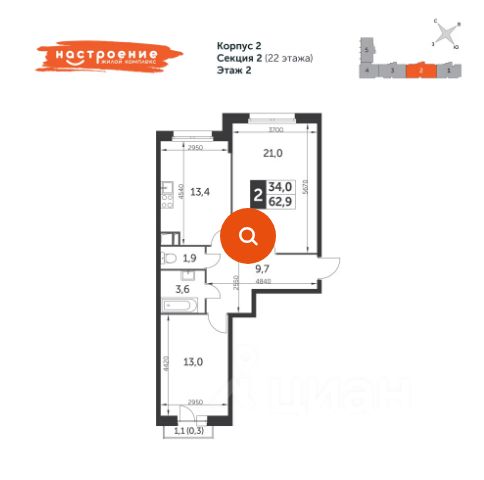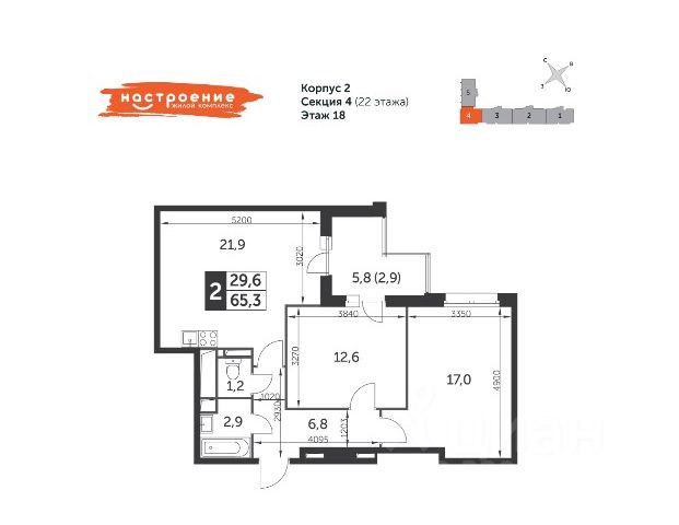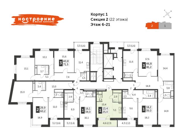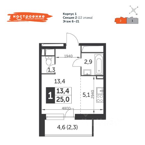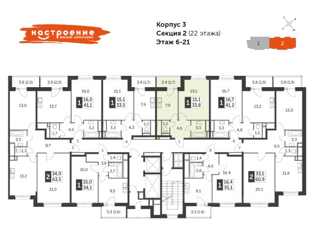 Корпус 4, корпус сдан, общей площадью 41.3 кв.м., на 15 этаже.