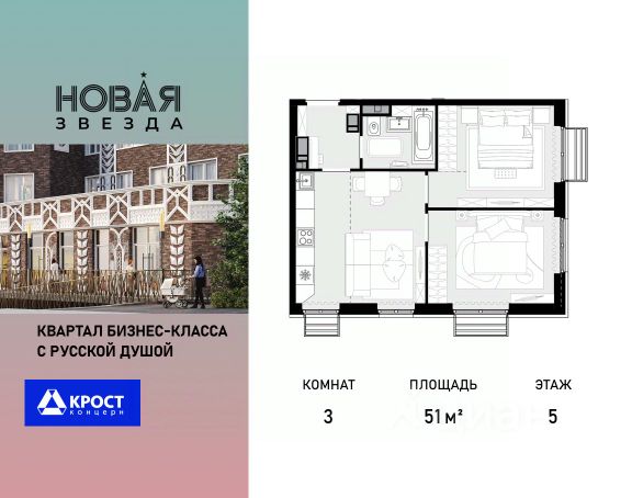 Продаётся 3-к квартира 51 кв.м. на 5-м этаже 22 этажного дома, корпус 2 - Резиденция "Сочи" . Без отделки. Легендарный квартал "Новая звезда" продолжается II очередью, которая спроектирована как мультифункциональный кластер. ЖК "Новая Звезда" расположен на территории Новой Москвы, в 10 мин. от м. Теплый стан и в 9 мин. пешком от строящейся станции метро "Бачуринская". Дизайн квартала спроектирован так, чтобы создать 2 города — Гостиный двор и комплекс жилых резиденций. Гостиный двор это стилобат, в котором разместятся рестораны, магазины, спортивные секции, детские кружки. Это место для активной городской жизни прямо в вашем квартале. Гостиный двор, безусловно, является уникальным форматом организации общественной жизни, предлагая жителям квартала весь необходимый спектр услуг в шаговой доступности от дома.. Жителям II очереди квартала "Новая звезда" будут доступны все инфраструктурные преимущества единого квартала: - образовательный кластер с уже построенной инновационной школой нового поколения; - спортивная инфраструктура; - торговые площади с услугами на первых этажах жилых домов.Прямая продажа от застройщика ООО СЗ "ГСД". Квартира квартир в Новая Звезда в Москве.