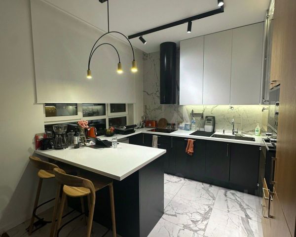 - Встроенная кухня укомплектована немецкой техникой (посудомоечная машина, духовой шкаф, индукционная варочная панель, тихая вытяжка).