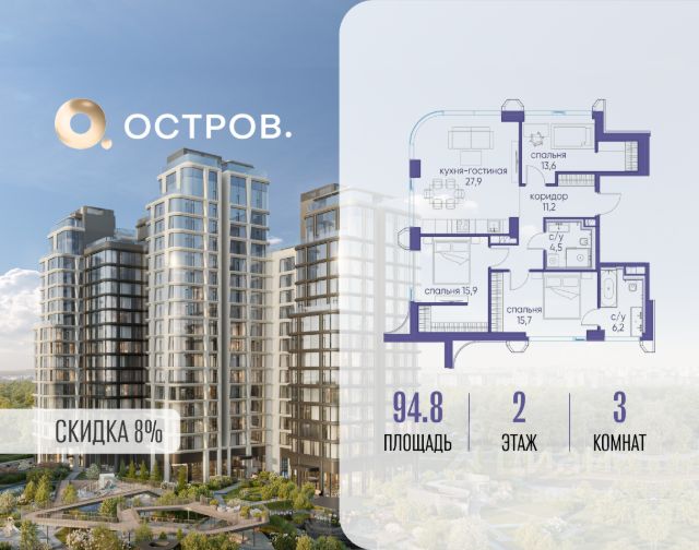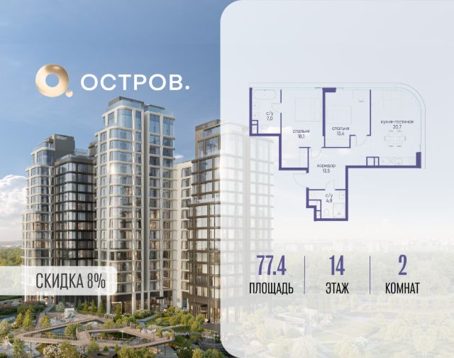 Скидка до 8% действует до 31.03.2026 г. при 100% оплате и не субсидированной ипотеке. Продаётся двухкомнатная квартира от застройщика: общая площадь 91.10 м², жилая 26.00 м², кухня 35.80 м², 5, жилой квартал "Остров 7", корпус 3 (7 квартал) (секция 1). срок сдачи: 4-кв. 2025. , 2 санузла: 2 совмещенных. В жилой зоне 2 больших окна на одну сторону, хорошая инсоляция. Позвоните сейчас и забронируйте квартиру! Купите квартиру в доме у прибрежного парка, в квартале ОСТРОВ.7. Это семь корпусов премиум- и бизнес-класса в одном из лучших мест ОСТРОВА - между бульваром и парком, поблизости от реки. Стильные корпуса имеют узнаваемый вид благодаря бионической пластике фасадов, приподнятых над землей. Для жителей предусмотрены детский клуб, фитнес-рум, коворкинг, переговорные, лаунжи. На крышах устроены видовые общественные пространства с зонами для отдыха и спорта. Двор расположен на двух уровнях: нижний ландшафтный парк и верхняя городская терраса. ОСТРОВ.7 - часть жилого комплекса на западе Москвы, в 15 минутах езды от центра. Это настоящий заповедник посреди большого города, в окружении реки и 650 га заповедников. Здесь все необходимое находится по соседству: от детского сада до супермаркета, от фитнес-зала до серфинг-центра. На территории созданы все условия для отдыха и общения: клубная инфраструктура в домах и дворы-парки, набережные и променады, маршруты для спортсменов, детей и возрастных жителей. В нескольких минутах ходьбы расположена станция метро "Терехово" БКЛ. На автомобиле - 10 минут до Москва-Сити и 15 минут до Садового кольца.