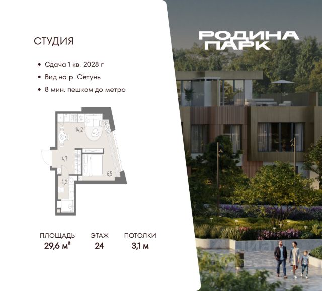 В жилом кластере Родина Парк рядом с природным заказником Долина реки Сетунь продаётся 2-комнатная квартира. Современный проект премиум-класса в Западном районе Москвы. Инновационный кластер Родина Парк представляет собой 5 жилых корпусов от 11 до 35 этажей, а также комплекс из 15 двухэтажных таунхаусов с террасами и эксплуатируемой кровлей. Также в проекте будет реализован деловой центр и многофункциональный комплекс со спортивной и развлекательной функцией. Расположение: - 8 минут до м. Давыдково - 15 минут до м. Славянский бульвар - 12 минут на авто до нового Арбата - 18 минут на авто до Москва-Сити Инфраструктура: - Рядом с проектом филиалы МГУ, МГТУ, МФЮА, а также Инновационный центр Сколково. - В 10 минутах езды находятся 6 школ из списка Forbes лучших частных общеобразовательных учреждений Москвы и области. - Свой детский сад на 95 мест, который будет построен на территории кластера. Внутреннее благоустройство: - Приватный двор-парк площадью 9000 кв.м - Детские площадки - Воркаут зоны - Ресторанная зона с летними верандами и фуд-холлом Лобби: - 5 тематических лобби в индивидуальном стиле - Лаунж-зоны - Игровые комнаты - Переговорные - Фитнес-зал - Подземный паркинг - Колясочные