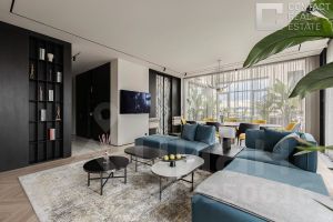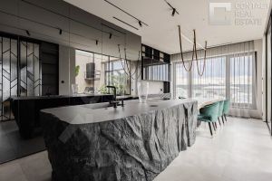 Квартира полностью укомплектована техникой Kuppersbusch и изысканной мебелью Cappellini Intagli. В ванных комнатах и санузлах предусмотрена сантехника брендов Laufen New, Hansgrohe, Timo Saona и Bossini, а эффектные светильники, люстры, торшеры и настенные бра — от брендов OR Illuminazione, Masiero, Italamp, Paralume Marina. Функциональная планировка включает кухню-гостиную с обеденной зоной и лаунжем, мастер-спальню с собственной ванной комнатой, и гардеробной, две спальни, гостевой санузел, постирочную, холл со встроенной системой хранения. Благодаря панорамному остеклению пространство наполнено естественным светом и теплом, открываются прямые виды на пруд и благоустроенный двор.