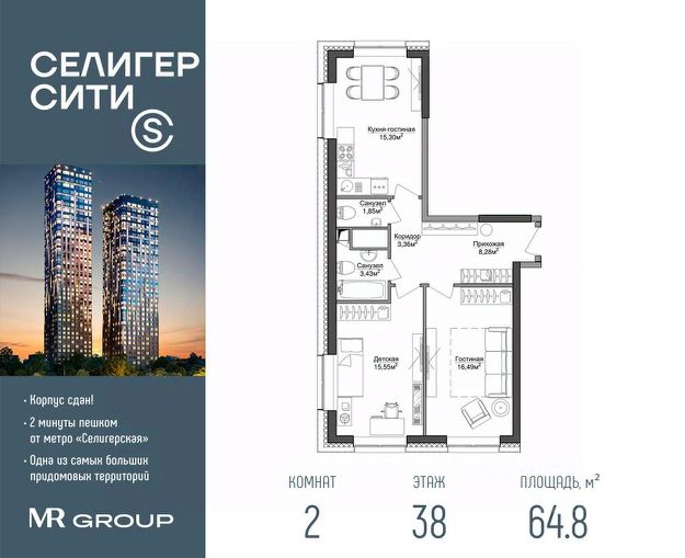 Прямая продажа от застройщика. Продаётся 2-комнатная квартира общей площадью 64.80 м² с предчистовой отделкой в ЖК "Селигер Сити" на 38-м этаже 38 этажного дома. Селигер Сити - это уютное пространство, где предусмотрена застройка разной этажности, чтобы каждый покупатель мог выбрать то, что ему по душе: невысокие дома или небоскребы, с верхних этажей которых будут открываться отличные виды на город. Первые три очереди сданы. Преимущества проекта: - 2 минуты пешком от метро "Селигерская" - Архитектурное решение от голландского бюро MLA + - 8 корпусов разной этажности от 8 до 45 этажей - Одна из самых больших придомовых территорий в Москве - размером с 4 футбольных поля - Огороженная охраняемая территория, круглосуточное видеонаблюдение - Европейский подход к благоустройству от бюро WOWHaus: детские площадки для разных возрастов, спортивные площадки, площадки воркаута, дорожки для бега и пеших прогулок, скейтпарк, хоккейная площадка, площадка для выгула собак - Искусственный пруд на территории комплекса с благоустроенной набережной и мостом - Продуманная концепция инфраструктуры: уютные кафе и рестораны, супермаркет, магазин фермерских продуктов, бытовые службы, салон красоты, детские сады - Панорамные окна высотой до 2,5 м, в корпусах 3 очереди витражное остекление высотой до 4,2 м - Широкий выбор квартир - от компактных студий до просторных квартир с тремя спальнями и пентхаусов - Четыре вида дизайнерской отделки квартир от бюро Вlank Architects - Возможность купить квартиру с предчистовой отделкой white box - "Умный дом" на платформе Ujin. Система безопасности, вход на территорию и в подъезд по биометрии или BLE-метке, въезд в паркинг по считывателю номера, контроль климата. Все для комфортной жизни! - Лобби по индивидуальному дизайн проекту от европейского бюро Вlank Architects: лаунж-зоны, ресепшен, колясочная, помещение для мытья лап животным после прогулки - Подземный паркинг на 2189 машино-мест по индивидуальному дизайну, с зарядными устройствами для электромобилей, постами для подкачки шин и келлерами - Надежный девелопер с опытом премиальных проектов MR Расположение комплекса: - 2 минуты от станции метро "Селигерская" - 7 минут на машине до станции метро "Окружная" - Предусмотрен удобный выезд в сторону ТТК (всего 9 км или 15 минут без пробок) - МКАД в 10 минутах на машине Компания MR предлагает своим клиентам специальные условия приобретения квартир в рамках программ ипотечного кредитования от банков-партнеров. Квартира квартир в Селигер Сити в Москве.