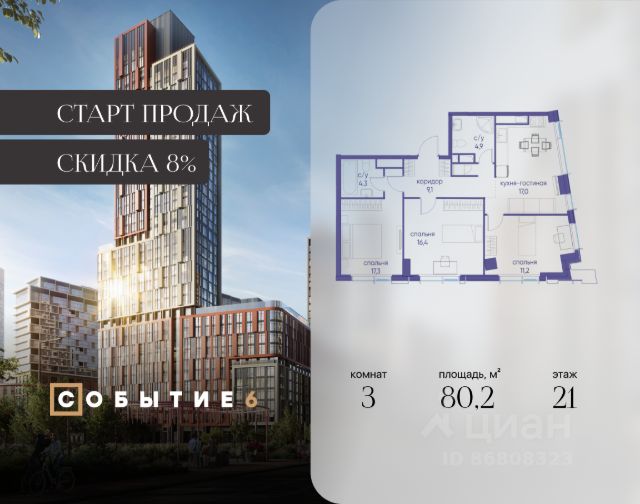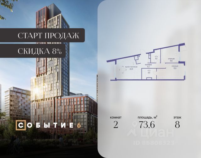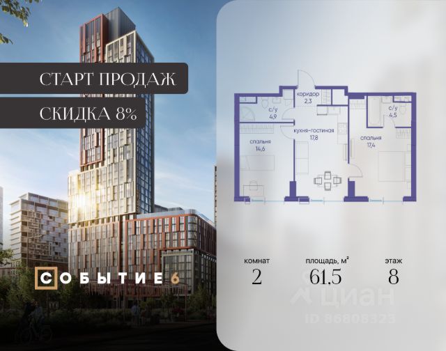 Акция квартира недели действует до 26.10.2025 на определённый пул квартир при 100% оплате и ипотеке без субсидированных программ. Подробности в офисе продаж. Продаётся 2-комнатная квартира от застройщика: общая площадь 61.50 м², жилая 32.00 м², кухня 17.80 м², 4-й этаж, жилой квартал "Событие-6", корпус 2 (секция 5) Срок сдачи: 1 квартал 2029 года. Позвоните сейчас и забронируйте квартиру! Продуманный до деталей. Созданный для жизни, полной счастливых событий. Парк-квартал СОБЫТИЕ - это жизнь класса премиум в престижном районе на Мосфильмовской улице. Архитектура мирового уровня. Выигрышное расположение на границе природного комплекса "Долина реки Раменки". Все для комфортной жизни и досуга: от детсадов и школ до ресторанов и медцентров. И новая точка притяжения - уже готовый парк "Событие" с пространствами активности для всех возрастов и интересов. Особенности квартала: • "Парящие" мосты и парк под облаками - уникальный дом с самыми завораживающими видами из окон "в пол" • Собственный парк - сразу за порогом! • Архитектурная концепция от известных международных бюро LDA Design и UHA London • Инфраструктура "тапочной доступности": в кафе, школу, магазин - за пару минут! • Внутренний двор - настоящее продолжение вашего дома: закрытая охраняемая территория без машин, развивающие детские площадки, воркауты-зоны для тех, кто хочет быть в форме, площади для праздников и посиделок с соседями. Продается квартира в ЖК Событие в Москве.