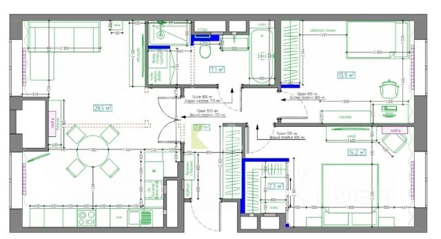Планировка: жилая площадь — 40 м², кухня — 17 м². Высота потолков — 3 метра