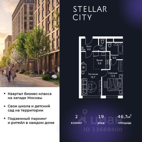 Продается квартира от надежного застройщика Tashir Estate в квартале бизнес-класса Stellar City в ЗАО Москвы. Площадь квартиры составляет: 46.7 кв. м, потолки: 3.1 м Квартира находится на 12 этаже, 4 корпуса жилого квартала Stellar City — микрогорода будущего на орбите Москвы. Stellar City — квартал в ЗАО Москвы вблизи инновационного центра Сколково. В окружении — 11 парков и природных зон, в том числе Долина реки Сетунь, Мещерский лес и парк развлечений The Rink. Город в городе Чтобы дом и инфраструктура вокруг отвечала динамичному лайфстайлу жителя мегаполиса, в основу проекта легла концепция город в городе, которая позволяет решать все бытовые вопросы in-home. В квартале будут возведены школа и детский сад, воркаут-зоны, променад, вело и беговые дорожки, детские площадки для каждого корпуса, а также коммерция на первых этажах для ежедневных покупок. Все необходимое — на расстоянии нескольких шагов. Изящные и лаконичные лобби Авторский дизайн, натуральные материалы в отделке и безупречный интерьер вне времени. Лобби и холлы в проекте бизнес-класса Stellar City ничем не отличаются от входных групп в премиум-сегменте благодаря качественным европейским материалам в отделке, стильному дизайну, консьерж-сервису и уютной зоне ожидания с журнальными столиками и мягкой мебелью. Комфорт и безопасность Закрытая территория, охрана, система СКУД, специально разработанное мобильное приложение дома для резидентов и подземный паркинг с круглосуточным наблюдением и доступом с помощью автоматического считывания номера авто. Продается квартира квартир в Stellar City в Москве.