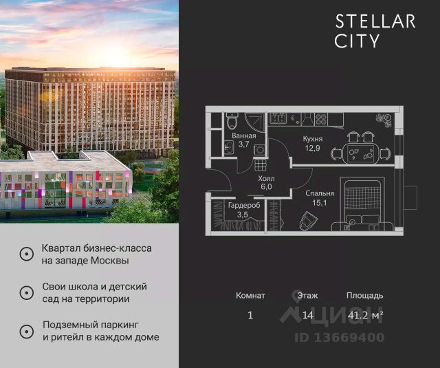 Продается квартира от надежного застройщика Tashir Estate в квартале бизнес-класса Stellar City в ЗАО Москвы. Площадь квартиры составляет: 61.3 кв. м, потолки: 2.9 м Квартира находится на 11 этаже, 4 корпуса жилого квартала Stellar City — микрогорода будущего на орбите Москвы. Stellar City — квартал в ЗАО Москвы вблизи инновационного центра Сколково. В окружении — 11 парков и природных зон, в том числе Долина реки Сетунь, Мещерский лес и парк развлечений The Rink. Город в городе Чтобы дом и инфраструктура вокруг отвечала динамичному лайфстайлу жителя мегаполиса, в основу проекта легла концепция город в городе, которая позволяет решать все бытовые вопросы in-home. В квартале будут возведены школа и детский сад, воркаут-зоны, променад, вело и беговые дорожки, детские площадки для каждого корпуса, а также коммерция на первых этажах для ежедневных покупок. Все необходимое — на расстоянии нескольких шагов. Изящные и лаконичные лобби Авторский дизайн, натуральные материалы в отделке и безупречный интерьер вне времени. Лобби и холлы в проекте бизнес-класса Stellar City ничем не отличаются от входных групп в премиум-сегменте благодаря качественным европейским материалам в отделке, стильному дизайну, консьерж-сервису и уютной зоне ожидания с журнальными столиками и мягкой мебелью. Комфорт и безопасность Закрытая территория, охрана, система СКУД, специально разработанное мобильное приложение дома для резидентов и подземный паркинг с круглосуточным наблюдением и доступом с помощью автоматического считывания номера авто. Продается квартира в ЖК Stellar City в Москве.
