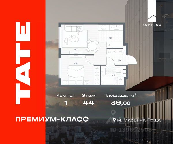 Успейте купить со скидкой 14%! Продается 1-к квартира общей площадью 40.88 м2 с предчистовой отделкой в ЖК премиум-класса ТАТЕ на 27-м этаже 41-этажной башни Б. ТАТЕ — жилой комплекс премиум-класса в историческом районе Марьина Роща на границе СЗАО и ЦАО. Две минималистские башни (41-49 этажей) с панорамными видами на Москву, Инфраструктура: светлые лобби с потолками 6 м, арт-лестница на террасу. Спа, фитнес с бассейном, детские/спортивные площадки. Трехуровневое благоустройство от WOW HOUSE. Доступ в жилой комплекс осуществляется по биометрическому контролю. Преимущества: - Авторский минимализм от ГК "КОРТРОС" (топ-10 RAEX) - Панорамные окна, потолки 3,02-4,5 м - Предчистовая отделка - Лаундж на 39 этаже для резидентов с панорамными видами на Останкино, ВДНХ - 6 скоростных лифтов (45 сек на этаж) - Безбарьерная среда, арт-пространства - Спа/фитнес, бассейн, паркинг с сервисами - Закрытая территория с видеонаблюдением и консьерж-сервисом 24/7 - Подземный паркинг на 545 машиномест с зарядками для электромобилей Транспорт: - 5 мин пешком до МЦД-2 - 5 мин до метро "Марьина Роща" - 15 мин до центра Москвы на автомобиле - 10 мин до ТТК - 20 мин до Москва-Сити