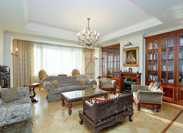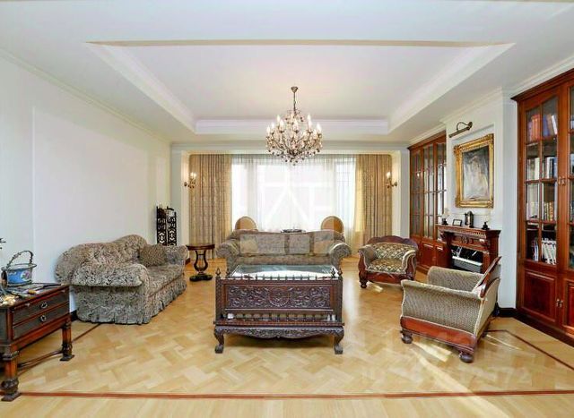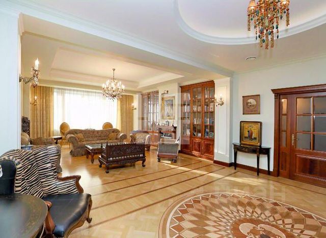 Квартира площадью 270 м² расположена на одиннадцатом этаже. Выполнена эксклюзивная отделка в стиле английской классики с использованием натуральных дорогостоящих материалов: мрамор, дерево, витражи, мозаика. Интерьеры наполнены мебелью, сделанной под заказ, бытовой техникой мировых от производителей. Кухня укомплектована техникой Kuppersbusch, ванные комнаты — Devon & Devon.