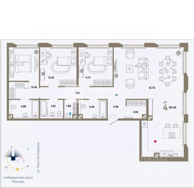 Удобная планировка включает три изолированные комнаты с площадями 13,56 + 12,52 + 11,71 кв.м (одна из которых мастер-спальня с собственным санузлом и гадеробной) и огромную кухню-гостиную площадью 52,76 кв. м, что идеально подойдёт для большой семьи. Три санузла обеспечивают удобство для всех жильцов. Планировочным решением предусмотрена постирочная и две гардеробных комнаты.