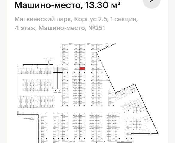 Продается машиноместо 251, рядом с входом в корпус 2.2. машиноместо в собственности, не под ипотекой и не под залогом. Есть агент по недвижимости, может помочь легко и быстро провести сделку. Если есть вопросы - звоните.