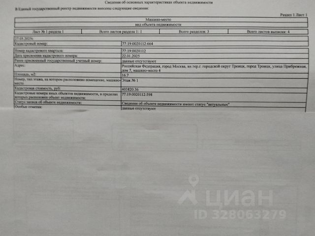 Продается машиноместо площадью 15,6 метра в многоуровневом паркинге в парковой зоне г. Троицка.