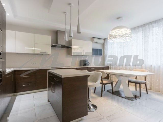 В интерьере преобладает светлая цветовая гамма, натуральный паркет, деревянные стеклопакет, элегантные лепные панели на стенах и стильные люстры. На кухне — дизайнерский фартук, встроенная бытовая техника и обеденная зона. Санузлы — с итальянской плиткой, современной сантехникой и тёплыми полами