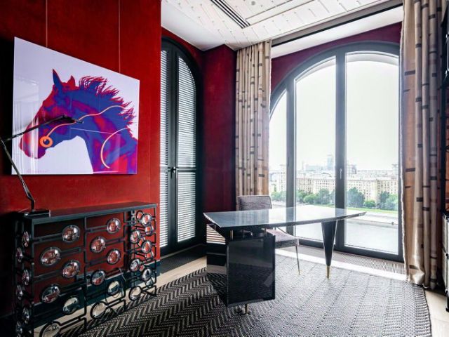 Арочные панорамные окна открывают длинные виды на *Москва-Сити, Саввинскую набережную и Москву-реку* - редкая комбинация направлений для дома Brodsky.