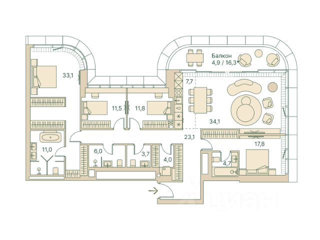 Планировкой квартиры предусмотрено: кухня с выделенной обеденной зоной, гостиная с современным камином, 4 спальные комнаты, две гардеробные, 4 санузла, включая гостевой. Отдельного внимания заслуживает просторная терраса, где оборудована зона барбекю для встречи гостей и совместного отдыха. В настоящее время в квартире идут ремонтные работы, - отличная возможность обустроить пространство в соответствии с Вашими идеями