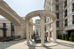Кухня (27,67 кв.м) с двумя большими окнами во двор на парковку. Вход в прачечную (5,06 кв.м). Напольное покрытие - натуральный оникс. Стены - окрашены. Потолок многоуровневый с лепниной. Кухонный гарнитур SCAVOLINI коллекция BACCARAT (белый лак) с столешницей из натурального камня и аналогичными подоконниками (полный комплект встроенной бытовой техники Kupperbusch).