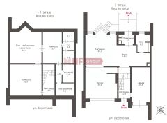 Общие помещения: изолированная кухня (20,5 кв.м), гостиная с камином (45,4), прихожая (27,6), гардеробная (6,8), постирочная (4,6), гостевой санузел (2,3).
