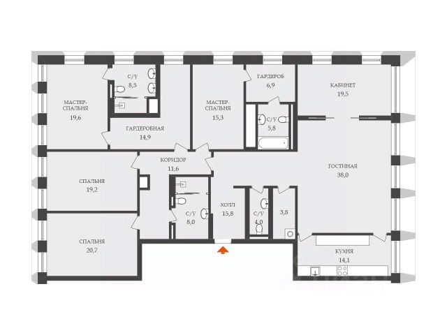 Планировка: гостиная с биокамином, кухня-столовая, мастер-спальня с собственной ванной комнатой и гардеробной, вторая спальня со своей гардеробной и санузлом, кабинет, который можно оборудовать как спальню, два санузла, гостевая гардеробная и холл. Окна ориентированы на две стороны света, открываются виды на благоустроенную территорию комплекса.