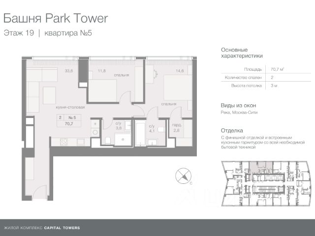 Премиальная отделка создает атмосферу уюта и элегантности, подчеркнутую высокими потолками и панорамными окнами.