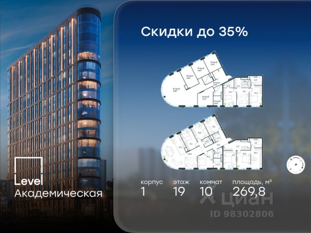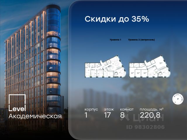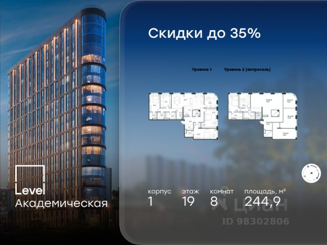 Цена указана с учётом скидки при 100%-й оплате, несубсидированной ипотеке, рассрочке (кроме программы "Рассрочка 0%"). В Академическом районе продаётся многокомнатная квартира площадью 244.90 кв.м без отделки. Квартира расположена на 19-м этаже 19-этажного жилого комплекса бизнес-класса Level Академическая (компания Level Group). Отличная транспортная доступность: - 1 мин. пешком до станции метро "Академическая"; - 4 мин. на автомобиле до ТТК; - 8 мин. на автомобиле до Садового кольца; - 13 мин. на автомобиле до Кремля. Продуманный архитектурный проект: - современная архитектура от бюро UNK project; - высокие потолки в квартирах до 6,62 м; - окна в пол высотой 2,5-2,68 м с панорамным видом на МГУ, Москва-Сити и другие доминанты Москвы; - квартиры с моллированным остеклением - радиусные окна открывают увеличенный угол обзора; - более 20 вариантов планировочных решений; - уникальные квартиры с собственным патио и возможностью обустройства дровяного камина; - квартиры сдаются без отделки, что открывает свободу для создания интерьера по своему вкусу. Расположение: Камерный проект из 1 корпуса расположен тихом зеленом районе Москвы, в непосредственной близости к центру города. В округе построено 80 детских садов, 50 школ и 30 вузов, 7 из которых входят в топ100 вузов России: МГУ, МГИМО, РАНХиГС, МИСИС, РУДН, РЭУ им. Плеханова и РГУ нефти и газа им. Губкина. Этот район буквально утопает в зелени парков, начиная с уютного Академического в 6 минутах пешком и заканчивая одним из крупнейших в городе парком 50-летия Октября (12 минут на автомобиле). Общая площадь природных объектов в радиусе 2-6 км от дома - 476,5 га. Внутренняя инфраструктура: На территории Level Академическая откроется собственный торговый центр, а для отдыха жителей будут созданы общественные пространства: комфортное лобби с дизайнерской отделкой, окнами в пол и потолками высотой 4,5 м, а также две благоустроенные зоны - территория по периметру здания и пространство на стилобате. Во дворе на стилобате предусмотрены детская и спортивная площадки, коворкинг и лаунж-зона на открытом воздухе. Стилобат украсят скульптуры животных - жирафа, зайца и волка, которые станут ярким акцентом внутреннего двора Level Академическая, подчеркивая близость к музею Дарвина. Процент озеленения территории - 58%. Технологии и безопасность: Жителей Level Академическая не коснется ежегодное отключение горячей воды благодаря собственным центральным водонагревателям. Безопасность гарантирует круглосуточная охрана, безлимитный Wi-Fi, круглосуточное видеонаблюдение. Удобное перемещение внутри комплекса будут обеспечивать 5 лифтов с доступом в паркинг с жилых этажей. Купить многокомнатную квартиру от застройщика в округе ЮЗАО в Москве.