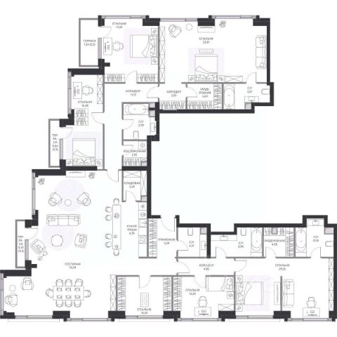 мастер-спальня со своим санузлом (душевая) и гардеробной комнатой;