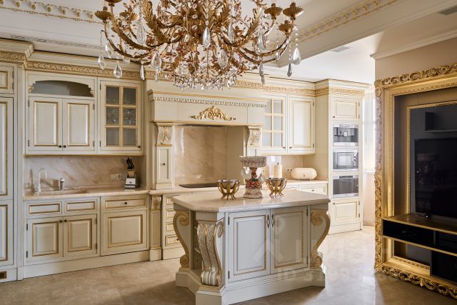Кухня Aster Cucine Италия с техникой Miele выполнена в белых тонах и от гостиной изолирована роскошной дизайнерской дверью со стеклом.