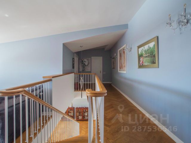 На второй этаж квартиры из гостиной ведет лестница с панельным поясом из махагона, декорированная фризом с золотым орнаментом.