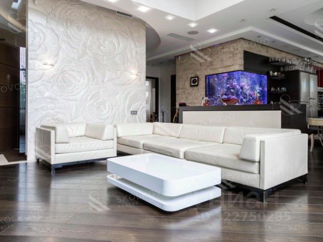 В прихожей и гостиной пол из мрамора: фоновый мрамор Crema Marfil ( -Испания), Negro Marquina ( Испания), на кухне мрамор Кот де Азур Панно (Италия), столешница на кухне серый мрамор Silver Wave (Италия), в гостиной мрамор Палисандро Реале (Италия), мрамор Bronze Amani (Италия), в ванной белый мрамор Калаката (Италия), черный мрамор Сахара Нуар (Италия), оникс Tropical, и серый мрамор Cippolo (Италия).