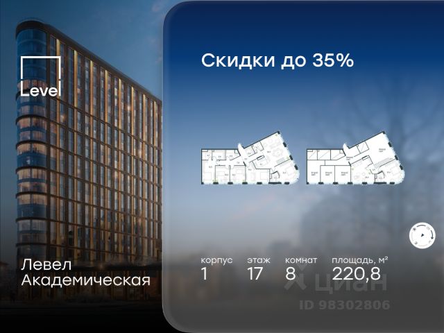 Цена указана с учётом скидки при 100%-й оплате, несубсидированной ипотеке, рассрочке (кроме программы "Рассрочка 0%"). В Академическом районе продаётся многокомнатная квартира площадью 244.90 кв.м без отделки. Квартира расположена на 19-м этаже 19-этажного жилого комплекса бизнес-класса Левел Академическая (компания Левел Group). Площади помещений определены кадастровым инженером по результатам обмеров. Отличная транспортная доступность: - 1 мин. пешком до станции метро "Академическая"; - 4 мин. на автомобиле до ТТК; - 8 мин. на автомобиле до Садового кольца; - 13 мин. на автомобиле до Кремля. Продуманный архитектурный проект: - современная архитектура от бюро UNK project; - высокие потолки в квартирах до 6,62 м; - окна в пол высотой 2,5-2,68 м с панорамным видом на МГУ, Москва-Сити и другие доминанты Москвы; - квартиры с моллированным остеклением - радиусные окна открывают увеличенный угол обзора; - более 20 вариантов планировочных решений; - уникальные квартиры с собственным патио и возможностью обустройства дровяного камина; - квартиры сдаются без отделки, что открывает свободу для создания интерьера по своему вкусу. Расположение: Камерный проект из 1 корпуса расположен тихом зеленом районе Москвы, в непосредственной близости к центру города. В округе построено 80 детских садов, 50 школ и 30 вузов, 7 из которых входят в топ100 вузов России: МГУ, МГИМО, РАНХиГС, МИСИС, РУДН, РЭУ им. Плеханова и РГУ нефти и газа им. Губкина. Этот район буквально утопает в зелени парков, начиная с уютного Академического в 6 минутах пешком и заканчивая одним из крупнейших в городе парком 50-летия Октября (12 минут на автомобиле). Общая площадь природных объектов в радиусе 2-6 км от дома - 476,5 га. Внутренняя инфраструктура: На территории Левел Академическая откроется собственный торговый центр, а для отдыха жителей будут созданы общественные пространства: комфортное лобби с дизайнерской отделкой, окнами в пол и потолками высотой 4,5 м, а также две благоустроенные зоны - территория по периметру здания и пространство на стилобате. Во дворе на стилобате предусмотрены детская и спортивная площадки, коворкинг и лаунж-зона на открытом воздухе. Стилобат украсят скульптуры животных - жирафа, зайца и волка, которые станут ярким акцентом внутреннего двора Левел Академическая, подчеркивая близость к музею Дарвина. Процент озеленения территории - 58%. Технологии и безопасность: Жителей Левел Академическая не коснется ежегодное отключение горячей воды благодаря собственным центральным водонагревателям. Безопасность гарантирует круглосуточная охрана, безлимитный Wi-Fi, круглосуточное видеонаблюдение. Удобное перемещение внутри комплекса будут обеспечивать 5 лифтов с доступом в паркинг с жилых этажей.