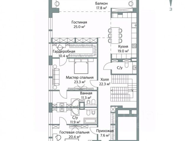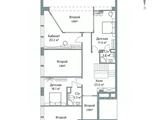 2 ЭТАЖ: две спальни / детские комнаты с собственными санузлами - 18 и 17 кв. м.; кабинет с панорамными окнами, обращенными в зону гостиной - 20 кв. м. Высокие потолки 5 м.
