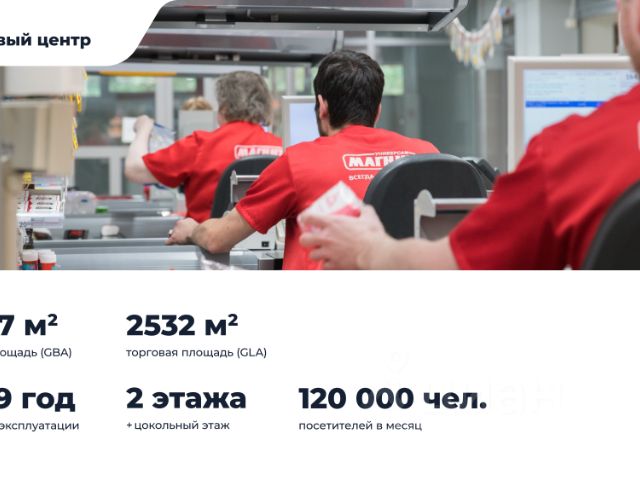 Продажа готового арендного бизнеса — Торговый центр Город, г. Москва Ключевые преимущества: • Готовый доходный бизнес с действующими арендаторами и заполняемостью 61,5% • Топ-локация: первая линия густонаселенного спального района. • Ежемесячно — более 120 000 посетителей • Общая площадь здания (GBA) — 2 927 м² • Торговая площадь (GLA) — 2 532 м² • Открытый паркинг на 30 машиномест Описание объекта: • 2 надземных этажа + цокольный этаж • Высота потолков — 3,5 м • Электрическая мощность — 250 кВт • Прочный монолитный железобетонный фундамент • Вентилируемый фасад из алюминиевых композитных панелей • Централизованное управление объектом Арендаторы и аудитория: • Якорный арендатор: продуктовый супермаркет "МАГНИТ", "МАГНИТ Косметик", FIX Price. • Также работают небольшие магазины продуктов, зоомаркет 4 лапы с груминг-центром, ПВЗ Яндекс и ОЗОН. • Основная аудитория — жители района, семьи с детьми, студенты, пенсионеры. • Средний возраст посетителей: 20-50 лет • Посещаемость: 3-4 раза в неделю Расположение: • Первая линии, отличная визуализация • Вблизи 4 остановки общественного транспорта • Густонаселенный спальный район • 15 минут до станции метро Дополнительная информация по телефону.