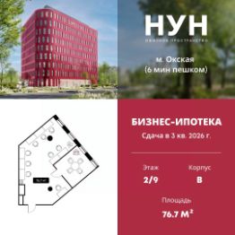 Продается офисное помещение площадью 76.7 м² в бизнес-центре НУН от застройщика Доминанта. ЮВАО, м. ОкскаяСрок реализации проекта - 3 квартал 2026 года. НУН - современный многофункциональный бизнес-центр с выразительным обликом, располагающийся в динамично развив...
