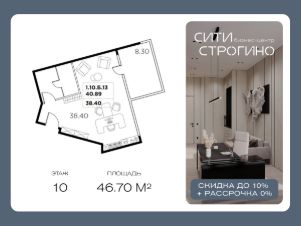 В продаже от застройщика комфортабельный Home-офис площадью 46.7 м² на 10 этаже в премиальном бизнес-центре Сити Строгино. Срок сдачи - 2028 год.
