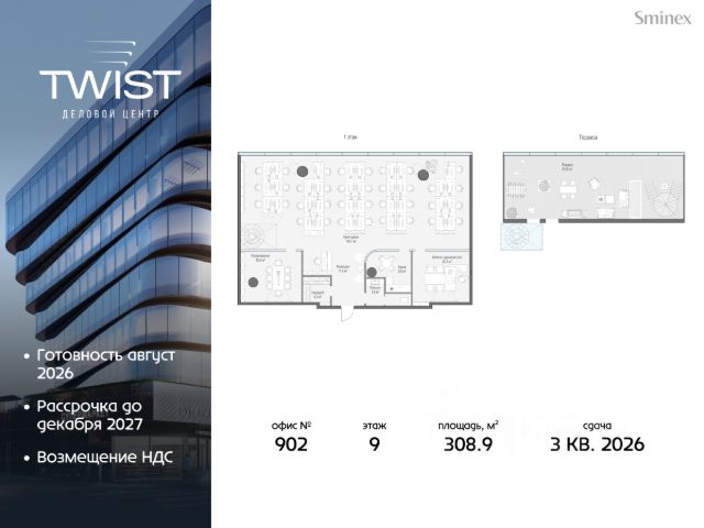 Готовность в августе 2026. Рассрочка до декабря 2027. Видовой офис площадью 291.3 кв.м. c собственной террасой на крыше.