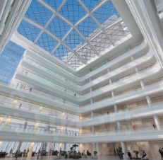 Современное здание 2008 года с просторным атриумом и панорамными лифтами.